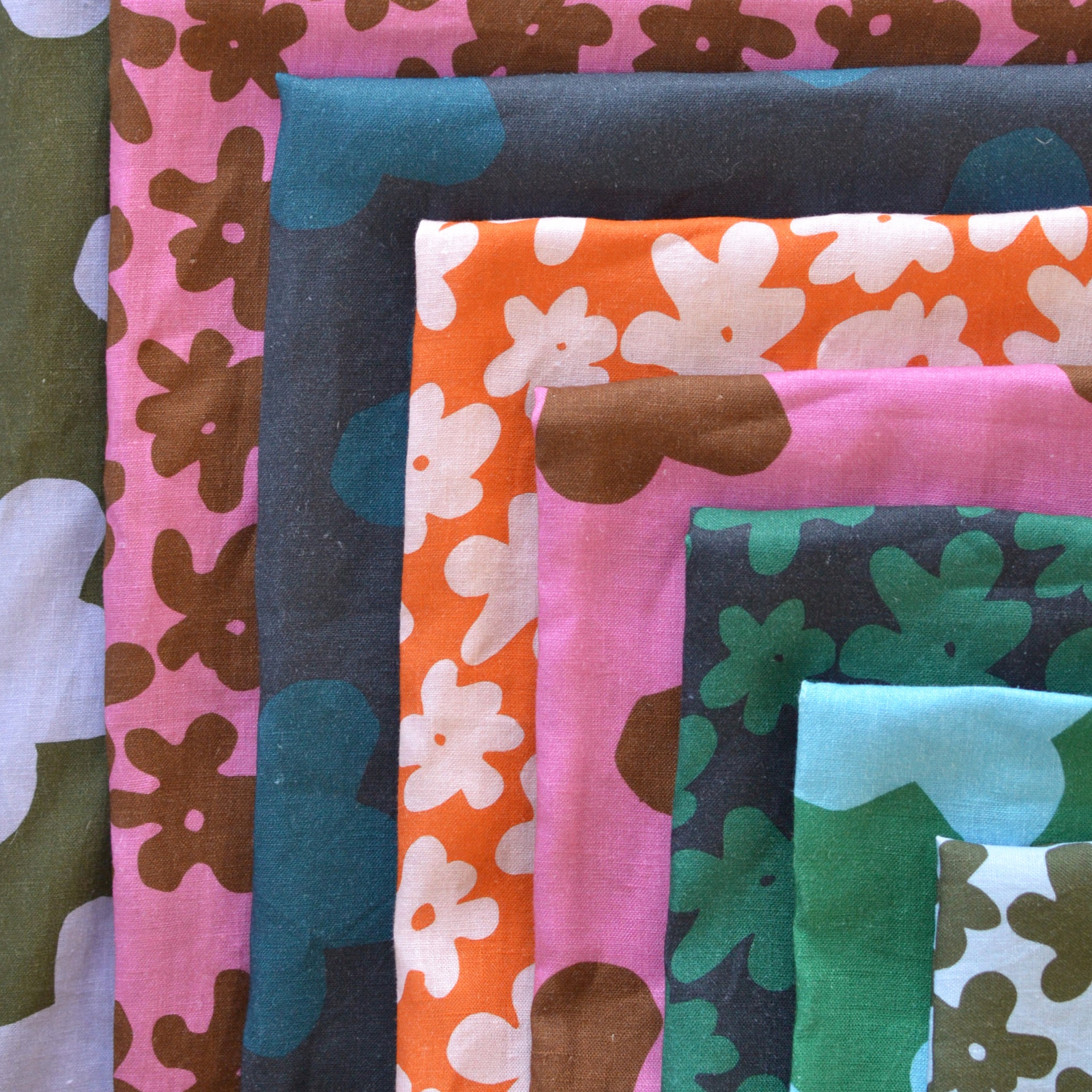 Bold Blooms is playful & simple pattern that will add a little fun and pop to your wardrobe or space. Available in four colour ways and two Linen weights. Suitable for a range of sewing projects across clothing, homewares and craft projects.